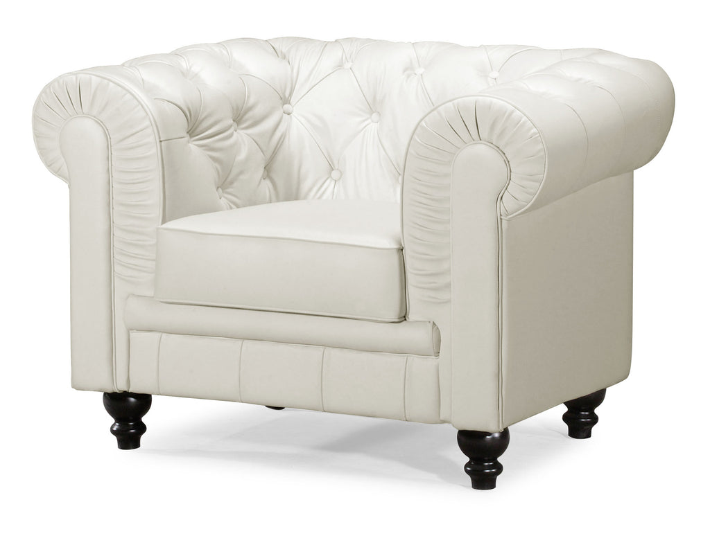 A modern take on a classic shape with ruffling, tufting, and buttons, the Aristocrat series comes in either black or white leather or silver leatherette with wood legs.