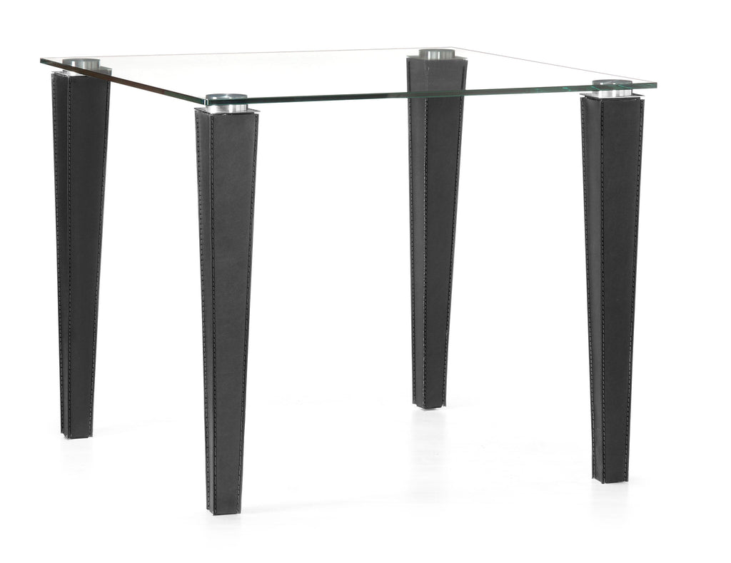 A modern take on a classic square dining table look, the Column diningtable has cool leatherette wrapped legs stitched in like color thread and a tempered glass top.