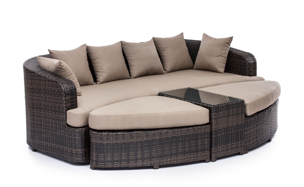 Multi-functional yet stylish, the Cove Beach lounge set can transform into a large bed or an intimate seating arrangement for guests. The frame is aluminum for durability and the weave and cushions are water and UV resistant.