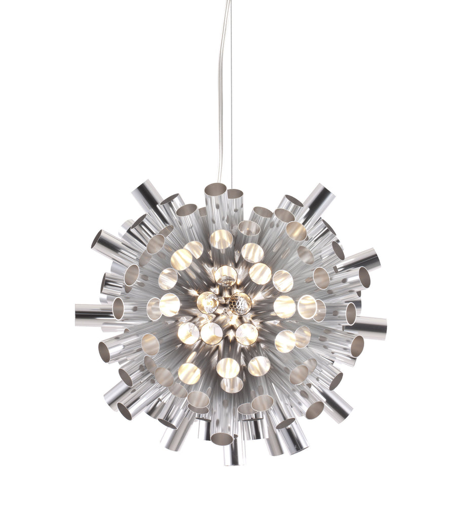 Let the burst of aluminum engulf you in all its luminescent glory. The Extravagance ceiling lamp has an aluminum shade with a chrome body. The lamp comes with ten 10W halogen bulbs and is UL approved. The height is fully adjustable.