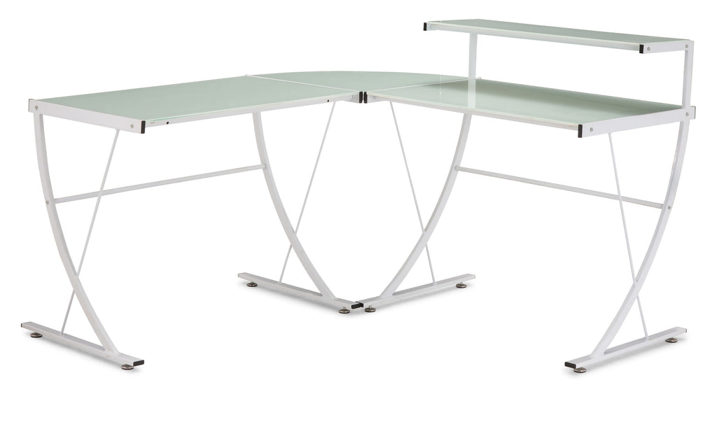 With its swooping lines and L-shaped functionality, the Fighter desk makes any work space ultra modern. The tops are frosted tempered glass with white epoxy coated steel tube frame.