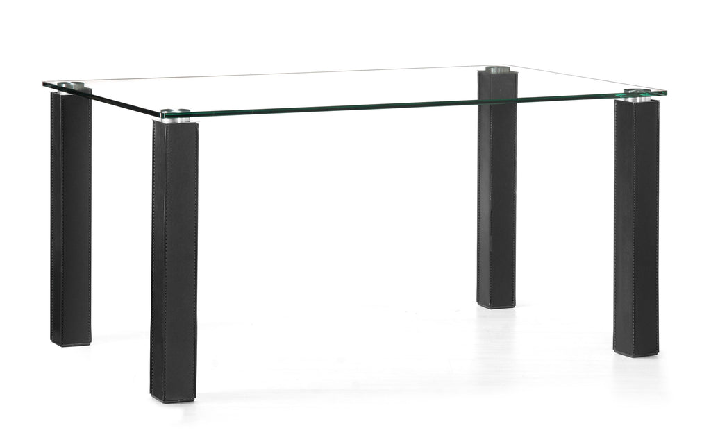 The Flag diningtable has a clean look and a sturdy design. It has a thick tempered glass top attached to leatherette with stitching wrapped legs through fused aluminum plates, seats four or six.