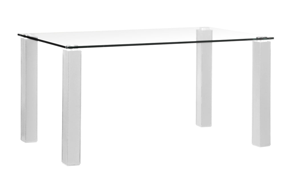 The Flag diningtable has a clean look and a sturdy design. It has a thick tempered glass top attached to leatherette with stitching wrapped legs through fused aluminum plates, seats four or six.