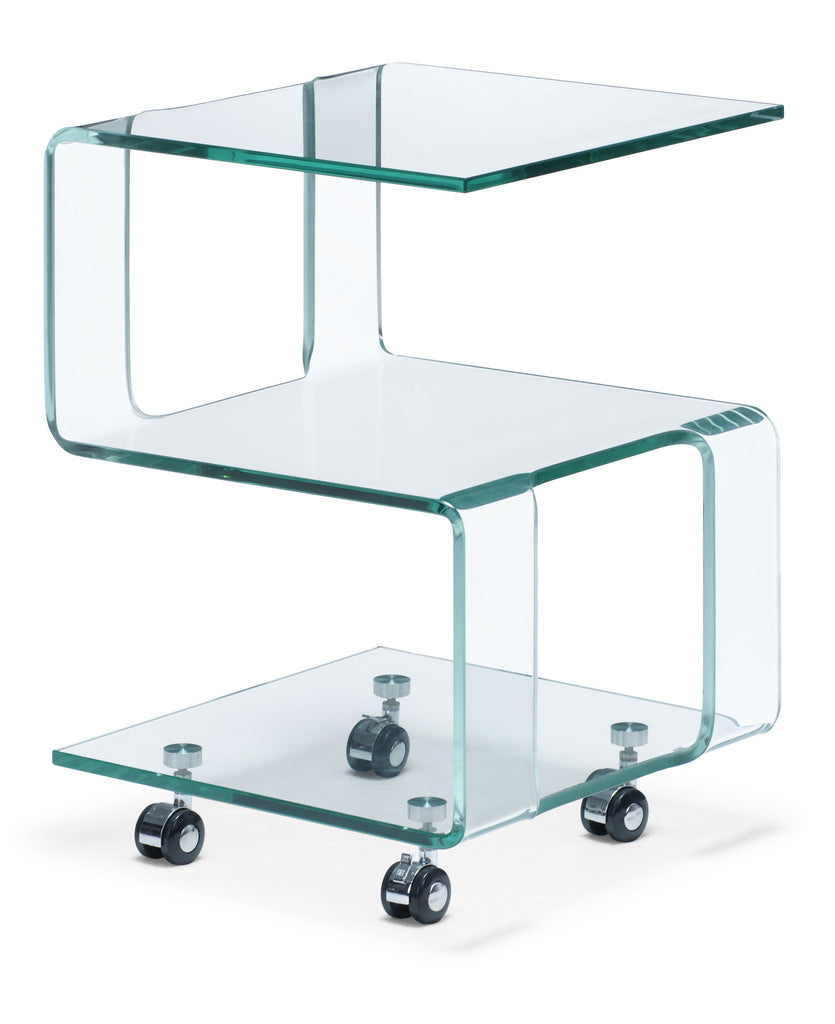 With multiple levels and rolling casters, the Magellan is made of bent semi-tempered glass.