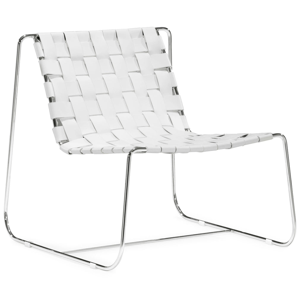 Submerge yourself in a supple braided leather seat. The Prospect lounge chair is made from 100% recycled leather braided onto a chrome base.