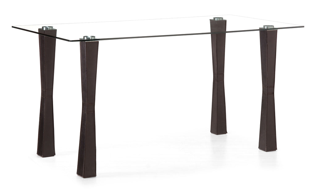 The Stilt table makes entertaining easy with its counter height and large expansive top. It has a thick tempered glass top attached to leatherette with stitching wrapped legs through fused aluminum plates, seats six easily.