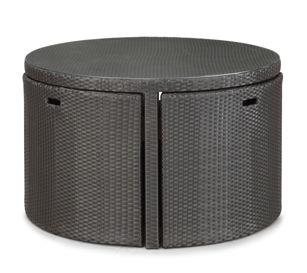The Tarfia Set brings outdoor dining to another level. The entire seating of the this set nests into a complete circle. The frames are constructed from epoxy coated aluminum and the weave from UV treated polypropylene for maximum resistance against the elements. The Table has a 10 mm thick clear tempered glass top and the seat cushions are made with a UV and moisture resistant washable polyester fabric.