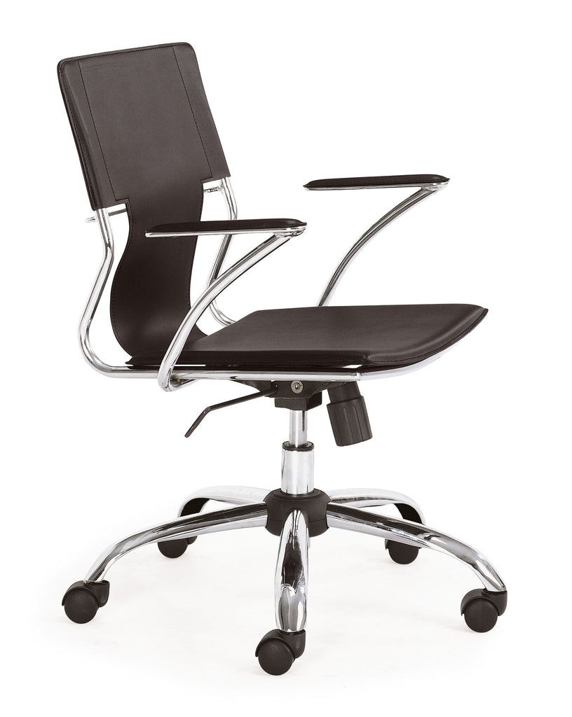 This fun and functional office chair combines a modern and transitional look. The Trafico office chair is made from a solid chrome frame, leatherette sling seat and arm pads, a chrome base, and an adjustable height mechanism.